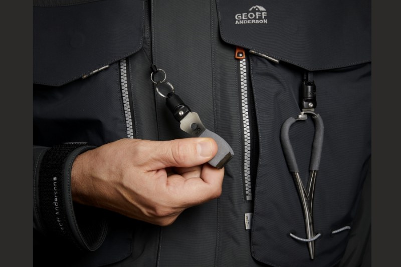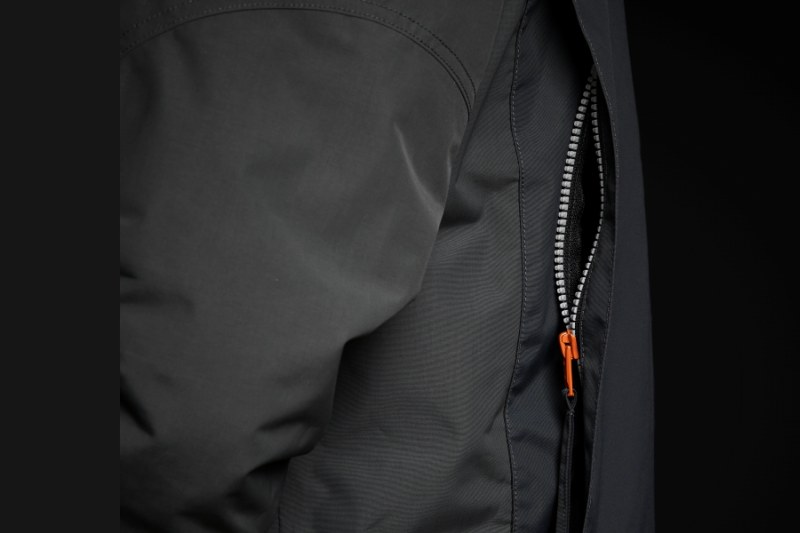 Na zápěstí je podšita tenká vrstva neoprenu „žraločí kůže“ spolu s patentovaným lisovaným uzávěrem na suchý zip Velcro®, který je zárukou pevného uzavření. Pod prohnutím předních kapes naleznete dva navíjecí systémy s kroužkem pro uchycení vašich oblíbených rybářských nástrojů. Obsahem bundy je také jeden magnetický systém o nosnosti 1,6kg.